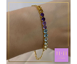 Com pedras naturais: citrino, ametista, topázio azul, sky e incolor. Pedras com o brilho maravilhoso, muito bem escolhidas.
